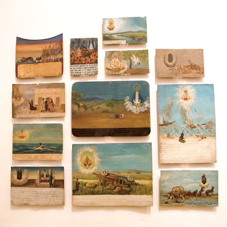 Part of Frida Kahlo’s collection of ex-voto paintings. Ex-voto paintings were commissioned as offerings of thanks to saints